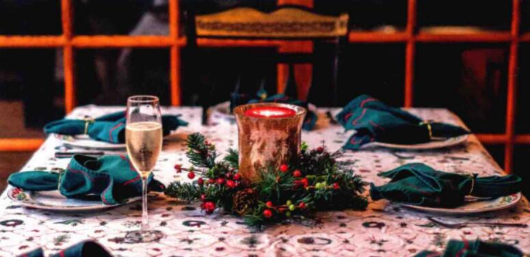 قم بفرش مفرش طاولة أبيض مع شرابات في وسط الطاولة الخشبية لتحديد منطقة وضع الأواني والزينة. نظرًا لقلة عدد المتناولين، يتم وضع أطباق خزفية بيضاء في طرفي المفرش، ثم يتم وضع مناديل مزينة بنفس اللون، ليكون الترتيب بسيطاً لكنه غير مبتذل. الزينة على الطاولة تتكون بشكل رئيسي من أشجار الصنوبر وأكواز الصنوبر، وتجمع بين شمعدانات خضراء بأطوال متفاوتة لخلق جو مليء بروح عيد الميلاد. ووضع قطعة حرفية صغيرة تحتوي على أضواء متسلسلة في زجاجة يعكس طابعًا دافئًا لا حدود له.