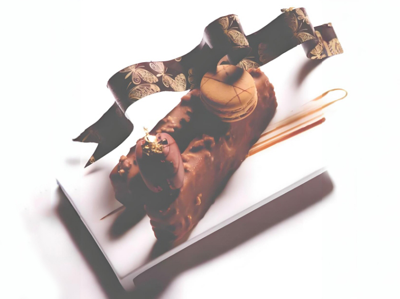 اختر طبقًا أبيض طويلًا مرتفعًا، وضع الماسكاربوني بشكل قائم على الجانب الأيسر من الطبق الطويل، لتخلق شعورًا بتراكم شكل مستطيل باتجاه الأعلى. ثم ضع فوق الماسكاربوني شريحة الشوكولاتة المزينة بشريط مع بعض الزينة مثل الماكرون بأشكال مختلفة. على الجانب الأيمن من الطبق، يمكن إضافة رسومات على الطبق، وإذا لم تكن واثقًا من الرسم، يمكنك استخدام ورق التغليف البلاستيكي كوسيط لإظهار خطوط ذات درجات لونية متدرجة بكل سهولة.