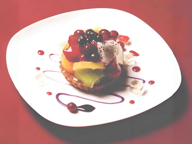 تُعتبر تورتة الفواكه أكثر من مجرد طبقات متراكمة، إذ يُمكن التأكيد على الخطوط والألوان على سطحها. باستخدام صحن مربع أبيض نقي يمكن إبراز هذه المميزات، مما يشكل تبايناً مع انحناءات الفواكه.