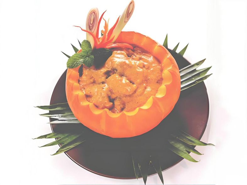 طبق الكاري بلحم البقر والقرع يستخدم الكاري الأصفر التايلاندي، الذي يتميز بنكهة غنية ولون لامع. اختيار الطبق الدائري الأبيض يساعد على إبراز اللون الذهبي الجذاب، كما يتناغم الشكل الدائري للطبق الأبيض مع القرع الدائري. يتم وضع أوراق الموز وزهور الجزر المنحوتة على جانب الطبق، مما يضفي لمسة من الأناقة على التقديم.