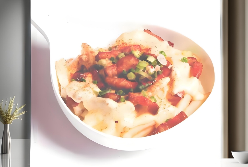 لأن ترتيب البطاطا المقلية على الطبق قد يبدو فوضويًا ومملًا، فقد تم هنا استخدام وعاء القرع ذو الشكل المميز بذكاء، حيث لا يمكن فقط ترتيب البطاطا المقلية بشكل منظم، بل أيضًا الاستفادة من خصائص أدوات المائدة لإضفاء لمسة من التصميم. أما الصلصة فتصب مباشرة على البطاطا المقلية، مما يجعل كل قطعة مغطاة بصلصة الجبن الكثيفة، كما أن هذا الطبق مناسب أيضًا لوضعه في الفرن لإعادة الشواء.