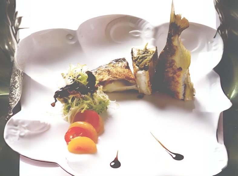 تستخدم هذه الطبق الزخرفي صحنًا دائريًا كبيرًا يشبه شكل بتلات الزهور. نظرًا للتباين الكبير بين حجم الطبق وحجم الطبق الرئيسي، أصبحت كيفية تحقيق التوازن في التصميم التحدي الأكبر. لملء مساحة الطبق وخلق إحساس بالطبقات، تم تقطيع السمك إلى ثلاثة أجزاء، مع إظهار جوانب السمك حيث يمكن رؤية الحشوة الداخلية من المخلل، مما يثير الشهية. تم رفع الذيل نحو الأعلى، ووضع الرأس بشكل أفقي لتمديد المساحة البصرية. بالإضافة إلى ذلك، أضاف الشيف القليل من المكونات الجانبية لتزيين الطبق، لكنه تجنب إضافة عناصر كثيرة لتجنب الفوضى، مع الحفاظ على أسلوب نظيف وبسيط.