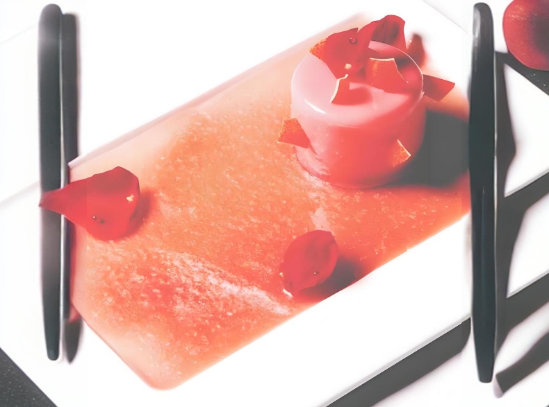 باستخدام لمسة خاصة وشفافة من الطلاء اللامع، تم تحويل الحوض المستطيل في الطبق إلى قاعدة وضعت عليها موس الجوافة المحضّر من الجوافة الحمراء التايوانية، والذي اتخذ شكل أسطوانة قصيرة. اللون الوردي الجذاب للموس يتناغم مع طلاء الجيلاتين اللامع، وفي النهاية تم تزيين الطبق ببتلات وردية صالحة للأكل من زهور عضوية من نانتو بوري، مما أضفى جواً رومانسياً يعم باللون الوردي!