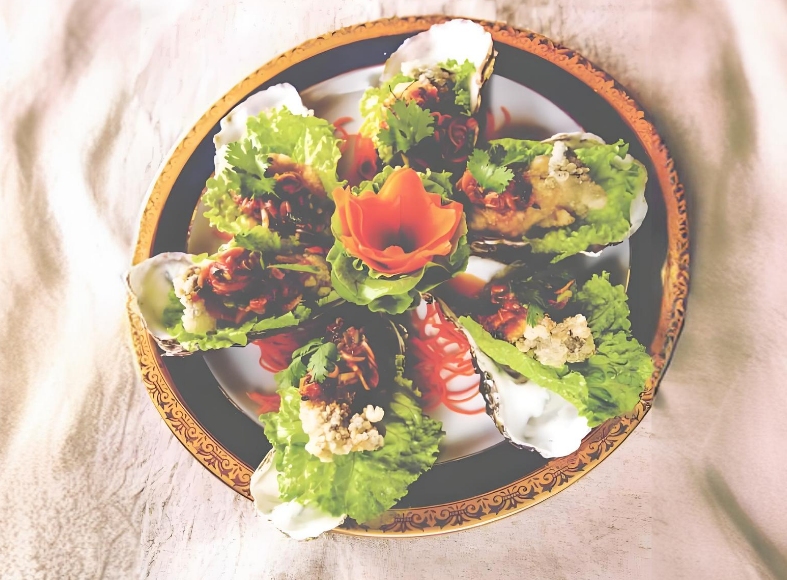 التنسيق بين اللون الذهبي والأزرق يعزز الشعور بالتباين القوي، ويزداد وضوحه مع المحار المقلي باللون الذهبي والخس الأخضر. التصميم المنقوش على حواف الطبق الذهبية، مع ترتيب المحار على شكل بتلات مشعة، يضفي على التقديم واللون جوًا ملكيًا مترفًا.