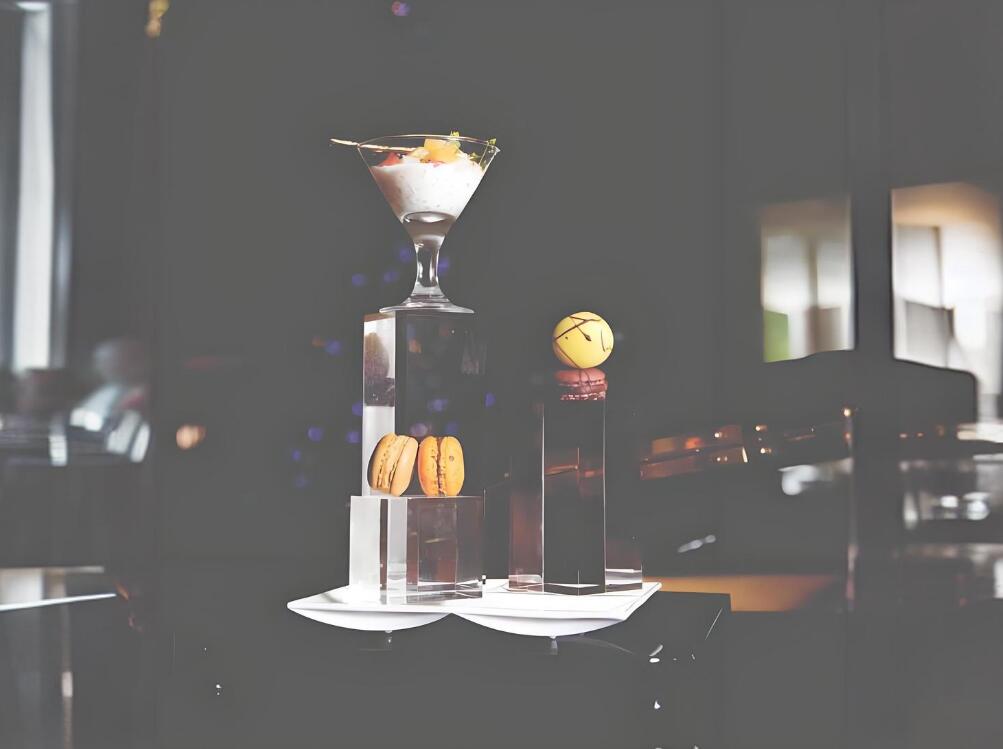 ② ضع الحلوى الرئيسية “ليمون الأناناس الصيفي” في كأس كوكتيل على أعلى عمود أكريليك. ثم ضع قطعة شوكولاتة مغلفة بورق الذهب مائلة على الكأس لإضفاء لمسة فاخرة.