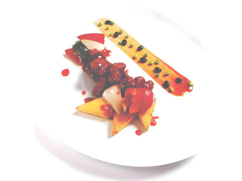 فونجلي غولاؤرو هو اسم في المطبخ الكانتوني، و”فونجلي” يشير في الواقع إلى الأناناس التايواني، أما غولاؤرو فهو لحم الخاصرة الحلو والحامض. يتميز الأناناس بلونه الذهبي وطعمه الحلو، مما يجعله مكونًا مثاليًا مع غولاؤرو. الفلفل الأخضر والفلفل الأحمر والبصل هي أيضًا إضافات شائعة في هذا الطبق. نظرًا لأن الطبق يأخذ شكلًا بيضاويًا، فقد تم استخدام صلصة الحلو والحامض ذات اللون الأحمر والبرتقالي لخلق تغييرات على شكل خطوط، كما تم استخدام اللون الذهبي للأناناس والأخضر للفلفل والأحمر للطماطم الصغيرة والأبيض للبصل لتسليط الضوء على التباين البصري. كما تم استخدام قطع مثلثة الشكل لإضفاء شعور هندسي ممتع على الطبق.