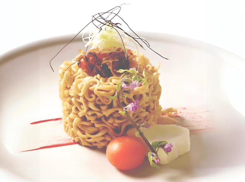 النودلز سريعة التحضير تمتاز بخطوطها المتعرجة، ولكن إذا وضعت مباشرة على الطبق، قد تبدو غير منظمة. هنا نستخدم طريقة التشكيل لإعطاء النودلز ارتفاعًا وشكلًا مميزًا.