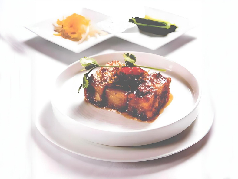 يستخدم هذا التقديم ثلاثة أواني صغيرة مختلفة، حيث يتم وضع المكونات بشكل منفصل. وبما أن الأواني تختلف في الشكل، فإنها تخلق جمالية تبدو متضاربة لكنها متكاملة بصريًا. نظرًا لأن الصحن المستدير صغير الحجم ودائري الشكل، تم تقطيع كعكة الفجل إلى شرائح طويلة لإبراز التباين في الشكل. من المهم أيضًا الانتباه إلى حجم الحصص، حيث يفضل أن تكون صغيرة لتتناسب مع طابع المأدبة الفاخرة.